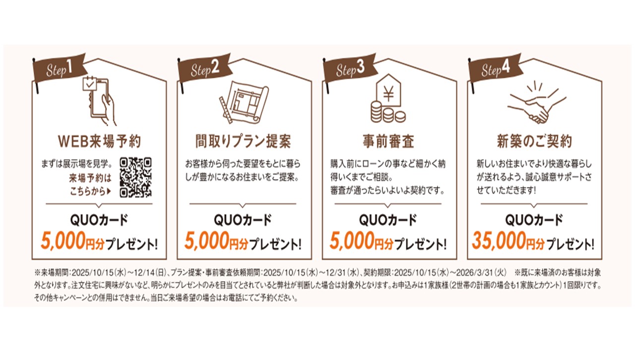 ホームページよりご来場の予約をしていただき、ご来場・ご見学いただいたお客様にクオカード5,000円分をプレゼントします!