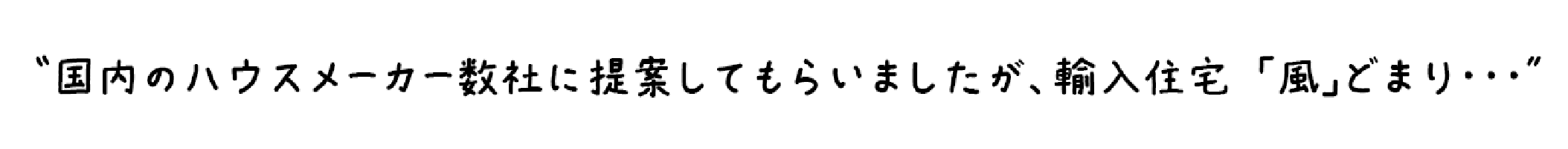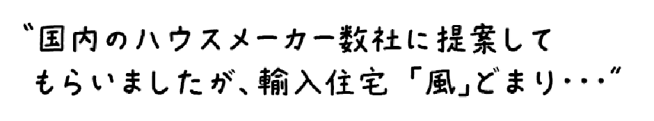 そのせいか、建売住宅も見に行きましたが、外観や内装に妥協できず、購入に踏み切れませんでした。また、国内のハウスメーカー3社にデザインを提案してもらいましたが、輸入住宅 「風」でしかありませんでした。それに、ハウスメーカーや工務店のデザイナーさんがこちらの求めるインテリアやデザインを提案してくれるか疑問でした。